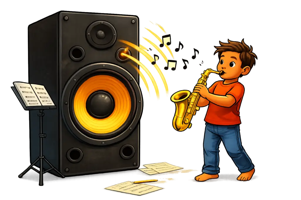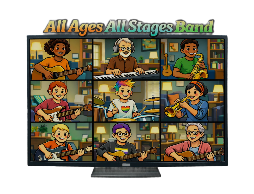 Here, beginners and advanced musicians share the same virtual stage — each at a level that meets them where they are. Backing tracks provide structure and comfort. Multiple skill tiers allow students to grow at their own pace. No one is rushed. No one is left behind. No one has to perform before they’re ready. Whether someone is 8 or 80, shy or bold, just starting or returning after years away, they can press play and become part of something bigger than themselves.